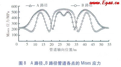 繪制出A路徑和B路徑上管道的Mises應(yīng)力分布曲線(見圖8),拉壓應(yīng)力和彎曲應(yīng)力的組合使得管道部分彎曲區(qū)域形成最小應(yīng)力區(qū)。