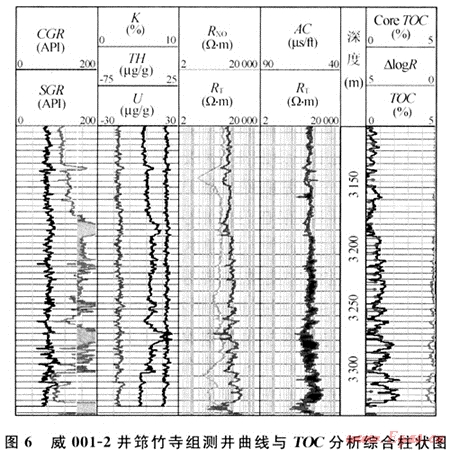 如前所述,隨深度的增加,筇竹寺組和龍馬溪組頁巖的顏色均具有自上而下逐漸加深的特點,而其自然伽馬值和有機質豐度也隨之逐漸增高(圖6)。威001-2是威遠構造上的一口新井,筇竹寺組的伽馬值在3175m以下明顯增加,一般都大于150API,而無論是根據測井曲線△㏒R(Passey,1989)計算的還是采用巖屑實測的TOC值,均顯示在該深度段以下一般都大于1.0%且逐漸增加的特征(圖6)。長寧構造上最近由中石油北京勘探開發(fā)研究院鉆探的1口淺井也顯示出龍馬溪組頁巖所具有的上述特征。該口淺井鉆遇了龍馬溪組中下部黑色頁巖層,110m深度段以上的TOC值一般在1.5%~2.5%之間,該深度以下TOC值劇增,均大于3%,最高約9%。