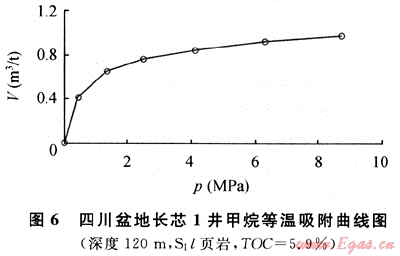 圖6為長芯1井120m處所取巖心的等溫吸附曲線(70℃等溫),該樣品為志留系龍馬溪組黑色頁巖,有機碳含量為5.9%,成熟度為3.26%。在70℃等溫條件下,隨著壓力增高,頁巖吸附甲烷的能力(V)逐漸增大,在壓力達(dá)到8.5MPa時,頁巖的甲烷吸附能力達(dá)到1m3/t。通過與美國5大頁巖氣盆地的頁巖等溫吸附曲線對比可以發(fā)現(xiàn),長芯1井志留系頁巖的吸附能力除與圣胡安盆地白堊系Lewis頁巖相近外,均低于其他盆地的頁巖。究其原因,筆者認(rèn)為很可能與成熟度有關(guān)。目前發(fā)現(xiàn)的進(jìn)行商業(yè)開發(fā)的美國5大頁巖氣盆地的頁巖,成熟度普遍不高,介于0.4%~1.9%之間。而熱成因的頁巖氣藏,頁巖成熟度較高,大多在1.1%以上,最高不超過3%。四川盆地長芯1井志留系頁巖的成熟度過高,Ro達(dá)到了3.26%,已進(jìn)入過成熟階段,這可能是導(dǎo)致其吸附能力較低的主要原因。另仔細(xì)分析可以發(fā)現(xiàn),美國5大頁巖氣盆地中圣胡安盆地白堊系Lewis頁巖的成熟度最高,為1.6%~1.88%,其頁巖的吸附能力則最小。