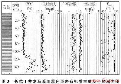 對上揚子地區(qū)下志留統(tǒng)龍馬溪組有機碳含量統(tǒng)計,發(fā)現(xiàn)下志留統(tǒng)龍馬溪組有機碳含量變化大,分布在0.1%~8.65%之間,多數(shù)大于1%。長寧-珙縣地區(qū)鉆探的長芯1井,通過對龍馬溪組下部黑色頁巖153m連續(xù)取心的有機碳含量分析(圖3)同樣反映出這種變化特征。在110m以淺,TOC含量處在1%~3%之間,平均為2%,110~153m井段(龍馬溪組最底部)TOC均大于2%,平均值可達(dá)到6%。全井段統(tǒng)計,TOC>2.0%的累計厚度可達(dá)80m,主要分布于龍馬溪組下段(包括上奧陶統(tǒng)約10m的五峰組碳質(zhì)頁巖),這將是形成頁巖氣藏最有利層段。