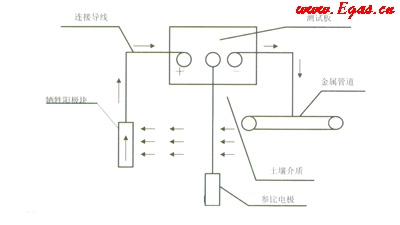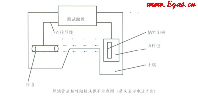 針對埋地管道電解化學腐蝕的過程和實際情況,我們應從兩方面解決管道的防腐問題。一是加強管道的絕緣性:①管道第一層涂環(huán)氧粉末;②第二層涂聚乙烯(PE);③第三層涂EVA樹脂。增火回路電阻,減少腐蝕電流。二是用犧牲陽極保護法,對管道進行陰極保護。見示意圖: