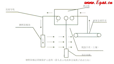 如果陽極開路電位大于管道保護電位,即大于管道最小保護電位,則金屬管道得不到保護,反遭腐蝕。金屬管道進行氧化反應,陽極塊進行還原反應,其原理與上圖相反,見示意圖: