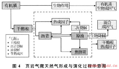 研究表明,熱成因氣的形成有干酪根成氣、原油裂解成氣和瀝青裂解成氣3種途徑:①干酪根成氣是由沉積有機(jī)質(zhì)直接熱解形成天然氣。②原油裂解成氣是有機(jī)質(zhì)在液態(tài)烴演化階段形成的、滯留在烴源巖中的液態(tài)烴,經(jīng)深埋藏后的高溫、高壓作用,進(jìn)一步裂解成氣。③瀝青裂解成氣的物質(zhì)基礎(chǔ)來(lái)源于兩個(gè)方面:一是源巖中干酪根在各演化階段生烴過(guò)程中形成的,另一方面是由原油裂解成氣或遭破壞形成的。原油及瀝青二次裂解生成的天然氣量大小主要取決于烴源巖中有機(jī)質(zhì)豐度、類型以及液態(tài)烴殘留量。由烴源巖有機(jī)質(zhì)熱演化直接成氣及原油裂解成氣是頁(yè)巖氣藏中天然氣的主要來(lái)源。