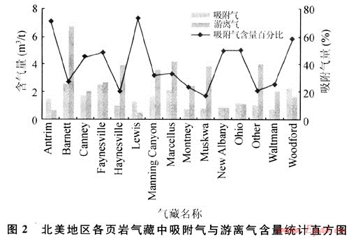 圖2為美國(guó)頁(yè)巖氣藏中的氣體組成統(tǒng)計(jì)結(jié)果,表明不同地質(zhì)條件下形成的頁(yè)巖氣藏其吸附氣與游離氣的含量存在較大差別。頁(yè)巖氣藏中吸附氣含量比例較高,變化范圍較大。頁(yè)巖含氣量最高的(如Barnett頁(yè)巖氣藏)可達(dá)10m3/t,最低(如New Albany頁(yè)巖氣藏)僅有1.1m3/t,含氣量平均為3.81m3/t。其中,吸附氣含量最低為16%,最高達(dá)80%。吸附氣含量的變化主要受巖石組成、有機(jī)質(zhì)含量、地層壓力、裂縫發(fā)育程度等因素影響,詳見(jiàn)后述。