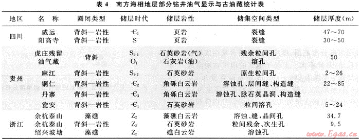 5) 鉆井天然氣顯示:不完全統(tǒng)計(jì),早期在常規(guī)油氣勘探過(guò)程中,在100口余鉆井中見(jiàn)到天然氣顯示或露頭發(fā)現(xiàn)古油藏及頁(yè)巖氣顯示(表4)。據(jù)四川盆地威遠(yuǎn)地區(qū)36口鉆井統(tǒng)計(jì),筇竹寺組頁(yè)巖有30口井發(fā)現(xiàn)氣顯示,志留系龍馬溪組13口井中有10口見(jiàn)氣顯示。威遠(yuǎn)地區(qū)的威5、威9、威18、威22和威28等井下寒武統(tǒng)泥頁(yè)巖均見(jiàn)氣侵井涌和井噴,其中威5井下寒武統(tǒng)筇竹寺組2795~2798m頁(yè)巖井段發(fā)現(xiàn)氣侵與井噴,中途測(cè)試日產(chǎn)氣2.46×104m3,酸化后日產(chǎn)氣1.35×104m3。川東南地區(qū)陽(yáng)高寺構(gòu)造帶的陽(yáng)深2、宮深1、付深1、陽(yáng)63、陽(yáng)9、太15和隆32等井在下志留統(tǒng)龍馬溪組多處發(fā)現(xiàn)氣顯示,其中陽(yáng)63井下志留統(tǒng)龍馬溪組3505~3518.5m黑色頁(yè)巖段,酸化后獲日產(chǎn)氣3500m3,隆32井下志留統(tǒng)龍馬溪組3164.2~3 175.2m黑色碳質(zhì)頁(yè)巖段獲日產(chǎn)氣1948m3。另外,20世紀(jì)70年代中期在貴州大方地區(qū)鉆探的方深1井,在下寒武統(tǒng)牛蹄塘組也發(fā)現(xiàn)良好氣顯示。該井下寒武統(tǒng)牛蹄塘組鉆遇井深1686~1785m,厚99m,巖性上部為一套深灰色含碳質(zhì)粉、細(xì)砂巖與碳質(zhì)頁(yè)巖互層,中-下部為黑色碳質(zhì)頁(yè)巖。有機(jī)碳含量2.97%~8.02%;氯仿瀝青“A”含量0.087%~0.11%,成熟度為高-過(guò)成熟。鉆井中,在1723.4~1726.7m井段見(jiàn)氣測(cè)異常,泥漿見(jiàn)雨?duì)顨馀?,含?8%,點(diǎn)燃呈藍(lán)色火焰,下伏震旦系全井段氣測(cè)異常,電測(cè)解釋6個(gè)含氣層、3個(gè)可能含氣層。