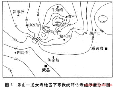 2) 下寒武統(tǒng)頁(yè)巖地層:分布面積大、范圍廣,可及整個(gè)揚(yáng)子地臺(tái)區(qū),現(xiàn)今殘留面積約90×104km2。烴源巖厚度50~500m,其中厚度大于50m以上烴源巖面積約58×104km2。發(fā)育的層位相當(dāng)穩(wěn)定,以下寒武統(tǒng)筇竹寺組為主,與之相當(dāng)?shù)倪€有川黔鄂地區(qū)的牛蹄塘組或水井沱組、蘇浙皖地區(qū)的荷塘組、冷泉王組等。巖性主要為暗色頁(yè)巖、黑色碳質(zhì)頁(yè)巖、碳硅質(zhì)頁(yè)巖、黑色粉砂質(zhì)頁(yè)巖。上揚(yáng)子地區(qū)的滇東、黔東北地區(qū)的頁(yè)巖地層普遍含磷,下?lián)P子地區(qū)夾石煤層。有機(jī)碳含量多在2.0%以上,最高可達(dá)13.64%,平均為2.77%。四川盆地下寒武統(tǒng)筇竹寺組井下樣品測(cè)試,有機(jī)碳含量平均為0.36%~5.03%,露頭樣品分析,有機(jī)碳含量平均為1.92%~2.35%(表3)。母質(zhì)類型以腐泥型干酪根為主,少量為腐殖型。干酪根δ13C為-29.82‰~-32.92‰(PDB),平均為-30.88‰,成烴潛力大。上揚(yáng)子與下?lián)P子地區(qū)頁(yè)巖演化程度較高,Ro一般大于3%,最高可至5%及以上;中揚(yáng)子地區(qū)頁(yè)巖的演化程度略低,Ro為2.0%~3.0%,部分還小于2.0%。目前在揚(yáng)子區(qū)已發(fā)現(xiàn)的古油藏,如貴州甕安古油藏、麻江古油藏、銅仁古油藏、浙江泰山古油藏、湘西南山坪古油藏、紹興坡塘古油藏等,油源均來(lái)自于下寒武統(tǒng)烴源巖。下寒武統(tǒng)烴源巖的分布范圍、厚度及有機(jī)碳含量在區(qū)域上基本穩(wěn)定,差異不大。上揚(yáng)子地區(qū)的四川盆地南部地區(qū)烴源巖厚度為200~400m,有機(jī)碳含量0.5%~5.00;至黔北、五陵、湘鄂西地區(qū)烴源巖厚度為50~500m,有機(jī)碳含量為0.5%~3.0%;江南隆起北緣生油區(qū)烴源巖厚度為200~400m,有機(jī)碳含量為0.5%~2%,至下?lián)P子地區(qū)西北部生油區(qū)烴源巖厚度是50~120m,有機(jī)碳含量為0.5%~5%;皖南、蘇南生油區(qū)烴源巖相對(duì)不發(fā)育,厚度在50m左右,有機(jī)碳含量為0.50~4%。下寒武統(tǒng)烴源巖生烴強(qiáng)度較高,部分地區(qū)為(100~200)×108m3/km2。四川盆地下寒武統(tǒng)筇竹寺組黑色頁(yè)巖厚74~400m,有機(jī)碳含量0.5%~4.1%,Ro為1.83%~3.26%。樂(lè)山-龍女寺地區(qū)下寒武統(tǒng)筇竹寺組發(fā)育最好(圖2),為一套淺水陸棚環(huán)境下沉積的黑色、深灰色頁(yè)巖,厚度一般為100~400m,資陽(yáng)-威遠(yuǎn)地區(qū)較厚,達(dá)250~350m,由古隆起頂部向南部坳陷區(qū)厚度大幅度增加。