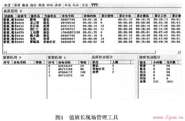 請注意,此處“當(dāng)前狀態(tài)”顯示的信息正是本文前述“工作狀態(tài)量化考核”中提及的基本內(nèi)容。如果“狀態(tài)”時間超標(biāo),對應(yīng)的“持續(xù)時間”一列數(shù)據(jù)顯示就會變成紅色,提示值班長應(yīng)予重點關(guān)注,必要時進行適當(dāng)干預(yù),確保服務(wù)熱線現(xiàn)場工作有序進行。管理工具的下半部顯示出各技能分組隊列放置情況、當(dāng)前話務(wù)統(tǒng)計數(shù)據(jù)及坐席人員配置現(xiàn)狀。一旦有情況,當(dāng)班值班長可以根據(jù)隊列狀態(tài)及時調(diào)整相關(guān)技能組的人員配置。