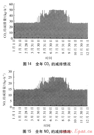 圖14、15為PEMFC建筑熱電聯(lián)供系統(tǒng)全年的C02和N0x的減排情況,涂黑區(qū)域的上邊界線表示系統(tǒng)運(yùn)行時(shí)的污染物減排量,下邊界線表示系統(tǒng)不運(yùn)行時(shí)污染物減排量為0。PEMFC建筑熱電聯(lián)供系統(tǒng)在夏季的減排效果明顯,這是因?yàn)橄募居袝r(shí)是2臺(tái)電池堆同時(shí)運(yùn)行。模擬計(jì)算結(jié)果為:PEMFC建筑熱電聯(lián)供系統(tǒng)與基準(zhǔn)方案相比,全年可減排C02量為133.2t,減排N0x量為67.1t。