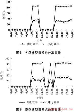 圖8、9為PEMFC建筑熱電聯(lián)供系統(tǒng)冬、夏兩季典型日的效率情況。在系統(tǒng)運(yùn)行時(shí),系統(tǒng)的供電效率大部分時(shí)間維持在30%~38%,熱電效率可達(dá)80%以上,夏季PEMFC建筑熱電聯(lián)供系統(tǒng)的使用率高于冬季。