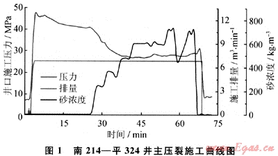 由于炮眼磨損引起的施工壓力變化在限流法壓裂施工曲線中有很明顯的顯示,圖1是南214-平324井的主壓裂施工曲線,從圖中可以看出支撐劑到達井底后,井口壓力大幅度下降,這在其他壓裂方式中是沒有的現(xiàn)象。此現(xiàn)象是由于支撐劑加入引起的混砂液凈液柱壓力、管柱摩阻和孔眼摩阻的變化綜合作用的結(jié)果。根據(jù)南214-平324井的井身結(jié)構(gòu)及施工情況定量計算出前兩項的值[6~7],可以發(fā)現(xiàn)它們對施工壓力的影響遠沒有這么大,因此可以判斷出現(xiàn)施工壓力如此大幅度降低的主要原因是孔眼受支撐劑打磨孔徑變大后,摩阻急劇降低造成的,但目前的壓裂設(shè)計軟件還不能模擬孔眼摩阻的動態(tài)變化對裂縫形態(tài)的影響。
