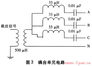 圖2中耦合單元電路見(jiàn)圖3。這個(gè)電路實(shí)際上是通過(guò)一個(gè)電感為500μH、匝數(shù)比為1:1的高頻耦合變壓器完成數(shù)據(jù)從載波通信芯片到電力線或電力線到載波通信芯片之間的傳遞。同時(shí)它還保證了電力線和通信電路之間強(qiáng)電和弱電的電氣隔離。在耦合變壓器前分別用三組帶通濾波器直接連接到電力線的A、B、C三相上。耦合變壓器的另一個(gè)輸出端直接和電力線的零線連接。濾波器的電感為33μH,電容為0.01μF。電感和電容串聯(lián)在270kHz的電路時(shí)構(gòu)成串聯(lián)諧振。對(duì)載波信號(hào)來(lái)說(shuō),它的阻抗幾乎為0,但對(duì)于工頻的信號(hào)阻抗很大。因此,這個(gè)電路能強(qiáng)烈抑制工頻信號(hào)的干擾,但能讓載波信號(hào)順利通過(guò)。