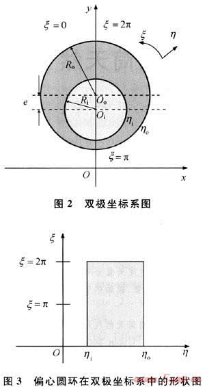 在直角坐標(biāo)系中,偏心圓的幾何形狀是不規(guī)則的,為了使邊界條件簡(jiǎn)化,引入雙極坐標(biāo)系;ξ和η為雙極坐標(biāo)系的坐標(biāo)分量,η從-∞到+∞;ξ從0到2π,可以覆蓋全平面;e為偏心距,即兩圓圓心的距離[5~6],如圖2所示。
