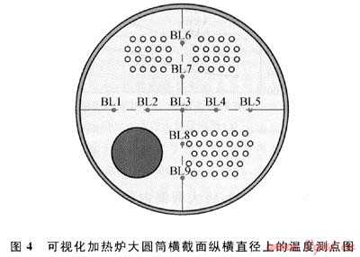 為對(duì)上述結(jié)論加以驗(yàn)證,進(jìn)行了大圓筒內(nèi)介質(zhì)流動(dòng)的可視化流場(chǎng)試驗(yàn),試驗(yàn)?zāi)康氖菍?duì)實(shí)測(cè)數(shù)據(jù)和觀察到的情況進(jìn)行分析,為加熱爐實(shí)物的試驗(yàn)和實(shí)際設(shè)計(jì)打基礎(chǔ)??紤]到大圓筒內(nèi)流場(chǎng)分布可能較紊亂,因此采用可視手段,目的是能夠觀察到流場(chǎng)的基本動(dòng)向。試驗(yàn)用可視化加熱爐大圓筒外殼由有機(jī)玻璃構(gòu)成,火筒和煙管束由黃銅制成,布置于大圓筒下方,用電加熱器加熱空氣模擬煙氣流入火筒經(jīng)轉(zhuǎn)向室流入煙管束然后排入大氣,電加熱器采用2kW、4kW、6kw的功率,由此形成熱風(fēng)循環(huán)系統(tǒng);大圓筒內(nèi)中間載熱介質(zhì)采用水,因水量較大,為使試驗(yàn)時(shí)介質(zhì)水的溫度能迅速達(dá)到要求,設(shè)計(jì)了預(yù)熱水系統(tǒng),即專門配備了預(yù)熱水箱,內(nèi)有電加熱器能較快地加熱介質(zhì)水,使其達(dá)到預(yù)定溫度后再注入大圓筒內(nèi);對(duì)流管束受熱面由紫銅管制成,布置于大圓筒上方,對(duì)流管束彎成“U”型,一端為進(jìn)口,一端為出口,被加熱流體為空氣,為控制其初始溫度,在冷風(fēng)系統(tǒng)中配有空調(diào)器以降低空氣溫度。為測(cè)量大圓筒圓截面上流場(chǎng)的溫度分布,在圓截面的縱軸和橫軸上布置了溫度測(cè)點(diǎn),編號(hào)分別為BL1~9,如圖4所示。試驗(yàn)時(shí)同時(shí)開啟冷風(fēng)及熱風(fēng)循環(huán)系統(tǒng),并通過預(yù)熱水系統(tǒng)將大圓筒內(nèi)中間載熱介質(zhì)水的溫度控制在41.7℃和63℃,以觀察流場(chǎng),并測(cè)試不同加熱功率對(duì)大圓筒內(nèi)水溫的影響。