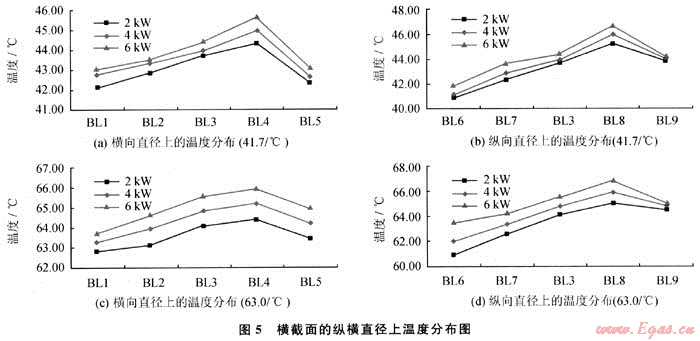 測(cè)試結(jié)果由圖5所示,在不同的加熱功率下,橫軸上測(cè)點(diǎn)BL4的溫度最高,縱軸上測(cè)點(diǎn)BL8的溫度最高,因?yàn)檫@兩個(gè)測(cè)點(diǎn)離火筒位置最近,而火筒是模擬煙氣的入口,氣流溫度最高,測(cè)點(diǎn)BL3至BL4的溫度變化幅度在中間載熱介質(zhì)水溫為41.7℃時(shí)比為63℃時(shí)大,其原因是介質(zhì)水溫較低時(shí),與火筒內(nèi)的氣流溫差較大,使火筒壁面附近對(duì)流換熱加大,介質(zhì)水溫上升快,因此火筒周圍形成了較強(qiáng)的上升流;而介質(zhì)水溫為63℃時(shí),由于介質(zhì)與氣流間的溫差較小,對(duì)流換熱相對(duì)弱,上升流的動(dòng)力也小??v軸上各測(cè)點(diǎn)溫度顯示:在不同的加熱功率和中間載熱介質(zhì)溫度下,溫度分層現(xiàn)象明顯,測(cè)點(diǎn)BL8溫度最高,自BL3、BL7至BL6依次降低,而BL9比BL8低,但高于其他測(cè)點(diǎn),這與流場(chǎng)換熱狀況相吻合;測(cè)點(diǎn)BL6的溫度,在加熱功率較小時(shí),會(huì)低于介質(zhì)溫度,表明在此附近區(qū)域加熱氣流提供的熱量不足,被加熱氣流只能吸收中間載熱介質(zhì)的初始熱量達(dá)到升溫的目的。試驗(yàn)結(jié)果證實(shí)了數(shù)值計(jì)算反映的大圓筒中間載熱介質(zhì)天然氣加熱爐流場(chǎng)中存在的問題。