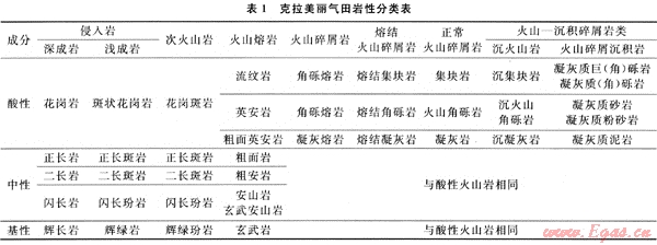 按照“成分+結(jié)構(gòu)、構(gòu)造+成因”的分類原則[1],對(duì)克拉美麗氣田石炭系火山巖巖石進(jìn)行了分類及命名,共分為7大類、28小類、上百種巖石類型(見表1)。