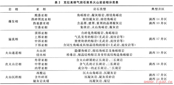 克拉美麗氣田石炭系屬于以中心式為主、裂隙式為輔的火山噴發(fā)模式,共發(fā)育3大類11種亞類32種巖石類型,包括爆發(fā)相的火山碎屑熔巖、熔結(jié)火山碎屑巖、火山碎屑巖,溢流相的玄武巖、安山巖、流紋巖,次火山巖相的正長(zhǎng)斑巖、二長(zhǎng)斑巖等?;鹕絿姲l(fā)能量較強(qiáng),內(nèi)部火山機(jī)構(gòu)正向隆起特征清晰。
