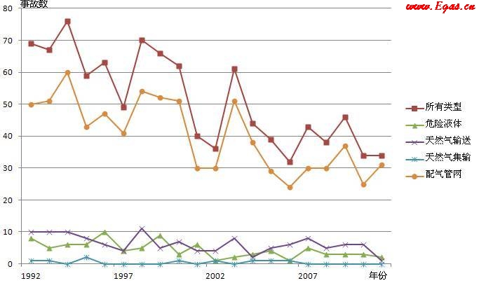 根據(jù)美國(guó)PHMSA管道失效數(shù)據(jù)庫(kù)統(tǒng)計(jì),管道系統(tǒng)發(fā)生的重特大事故中,約80%是由城鎮(zhèn)燃?xì)夤芫W(wǎng)導(dǎo)致的事故(見(jiàn)圖 1),因此針對(duì)城鎮(zhèn)燃?xì)夤芫W(wǎng)開(kāi)展完整性管理具有重要意義。美國(guó)針對(duì)DIMP的研究從2000年左右開(kāi)始。2005年管道和危險(xiǎn)材料安全管理局(Pipeline&HazardousMaterialsSafetyAdministration,簡(jiǎn)稱(chēng)PHMSA)、燃?xì)廨斉涔I(yè)協(xié)會(huì)和國(guó)家管道安全協(xié)會(huì)共同發(fā)布了《燃?xì)廨斉涔艿劳暾怨芾?mdash;—第一階段調(diào)研報(bào)告》,此后美國(guó)有多家相關(guān)的政府機(jī)構(gòu)、協(xié)會(huì)組織和研究機(jī)構(gòu)參與了燃?xì)夤芫W(wǎng)完整性管理的研究工作,并進(jìn)行相關(guān)標(biāo)準(zhǔn)的制定以及完整性管理開(kāi)展情況的檢查和審查工作。