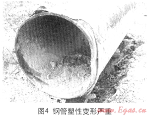 另外,施工單位應(yīng)有回拖時(shí)卡管情況下的應(yīng)急預(yù)案,龍大高速穿越卡管發(fā)生在第三塊孤石處,此時(shí)只需稍微后拉一下的擾動(dòng),再重新回拖時(shí)就可能錯(cuò)過(guò)卡點(diǎn)。由于管道浮在泥漿中,這是不難做到的,而一味強(qiáng)拖則會(huì)越卡越緊。由于施工單位沒(méi)有合適的應(yīng)急預(yù)案,結(jié)果發(fā)生卡管時(shí)應(yīng)對(duì)失當(dāng),先是長(zhǎng)時(shí)間停泵使泥漿干涸凝固,而后又在沒(méi)有鉆機(jī)有效引導(dǎo)情況下,用夯管錘暴力全程強(qiáng)夯,結(jié)果管段偏離管孔前行,導(dǎo)致鋼管塑性變形嚴(yán)重超標(biāo)(圖4)。