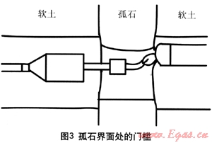 有人認(rèn)為增加洗孔次數(shù)可避免卡管,實(shí)際上在堅(jiān)硬孤石與松軟土壤交錯(cuò)分布的情況下,由于松軟土壤被反復(fù)沖刷,使得孔徑遠(yuǎn)大于堅(jiān)硬孤石上的孔徑,從而在兩者交界處形成門(mén)檻。洗孔次數(shù)越多,門(mén)檻越明顯,管道回拖時(shí)發(fā)生卡管的風(fēng)險(xiǎn)越大(圖3)。