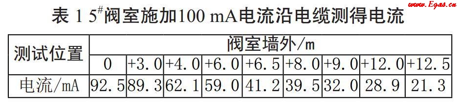 將RD8000的發(fā)射機(jī)正極連接陽極電纜,負(fù)極接地,調(diào)節(jié)適當(dāng)頻率。打開電源,輸出正常。打開接收機(jī)電源,調(diào)節(jié)頻率與接收機(jī)一致,查找電纜位置走向,同時測量電流大小。當(dāng)電纜上方前后電流大小有明顯變化時,初步判斷該處電纜斷點(diǎn)或虛接(表 1)。
