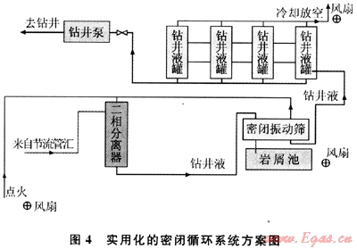 針對塔中碳酸鹽巖儲(chǔ)層主要為氣藏,沒有油相分離需求;氣田地處荒漠地區(qū),含硫天然氣通過燃燒排放后對大氣環(huán)境的影響不大的特點(diǎn),可以考慮如下實(shí)用化方案:使用氣液二相分離器加密閉振動(dòng)篩替代四相分離器。先利用氣液二相分離器將高含硫氣體分離出來,直接進(jìn)行燃燒排放;然后利用密閉振動(dòng)篩將巖屑分離出來,鉆井液可重新循環(huán)使用。