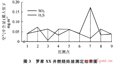 從分離器分離出來的高含硫氣體,如果直接排放到大氣中會(huì)造成嚴(yán)重的環(huán)境污染,需要進(jìn)行燃燒排放處理。但是現(xiàn)有的資料和現(xiàn)場情況表明,燃燒排放處理難以保證實(shí)現(xiàn)有毒有害氣體的零排放,對環(huán)境仍會(huì)造成污染。為了搞清楚高含硫天然氣燃燒排放后的大氣環(huán)境情況,分別在羅家X井和羅家XX井利用試井過程進(jìn)行了燃燒排放實(shí)驗(yàn)。其中,羅家XX井(H2S含量為133.37g/m3)燃燒排放時(shí)環(huán)境空氣中S02和H2S測定結(jié)果如圖3所示。