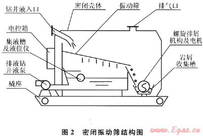 根據(jù)上述方案,完成了密閉振動(dòng)篩結(jié)構(gòu)設(shè)計(jì)。采用的技術(shù)方案是:將振動(dòng)篩置入一個(gè)密閉的金屬殼體內(nèi),殼體置于橇座上,不但能防止H2S外泄,同時(shí)也便于吊裝和運(yùn)輸;殼體內(nèi)設(shè)置巖屑收集槽和螺旋排屑機(jī)構(gòu)、集液槽和液位檢測儀,便于及時(shí)排屑、排液;排屑電機(jī)和排液鉆井液泵、電控箱安裝在殼體外,避免在高濃度H2S氣體環(huán)境下發(fā)生燃爆;殼體上部設(shè)置通氣法蘭,便于連接抽氣設(shè)備排出殼體內(nèi)高濃度的H2S氣體。