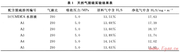 通過實(shí)驗(yàn)測試氨洗脫硫前后高含硫天然氣中硫化氫濃度的變化,可以評(píng)價(jià)高含硫天然氣氨洗脫硫效果。表1為幾種脫硫溶劑對高含硫天然氣的脫硫?qū)嶒?yàn)效果。