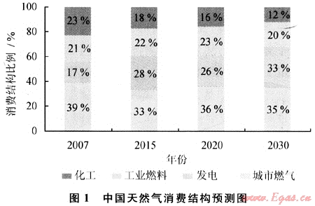 2) 城市燃?xì)?、CNG等將成為天然氣主要利用領(lǐng)域。結(jié)合中國天然氣工業(yè)發(fā)展歷程和天然氣消費(fèi)結(jié)構(gòu)變化趨勢,預(yù)計今后中國的天然氣利用方向首先是滿足城市燃?xì)?、CNG等需求;其次是以氣代油、以氣代煤作為工業(yè)生產(chǎn)的燃料,以改善不斷惡化的大氣環(huán)境;天然氣發(fā)電具有效率高、清潔環(huán)保等優(yōu)勢,許多國家積極發(fā)展,中國受到資源和天然氣發(fā)電經(jīng)濟(jì)性影響,將適度發(fā)展,以優(yōu)化電源結(jié)構(gòu)。據(jù)統(tǒng)計,中國283個地級市及以上城市中約有188個已經(jīng)用上天然氣,2008年城市燃?xì)庀M(fèi)量在300×108m3左右,受國民經(jīng)濟(jì)發(fā)展及城市化進(jìn)程影響,預(yù)計到2020年將超過1600×108m3,年均增長9.8%。車用CNG因其獨(dú)有的經(jīng)濟(jì)與環(huán)保優(yōu)勢,將得到持續(xù)發(fā)展。以小型汽車為例,CNG汽車與汽油車相比每百公里節(jié)省燃料費(fèi)60%左右。而且CNG汽車較普通燃油汽車維護(hù)維修費(fèi)用下降約40%,發(fā)動機(jī)壽命延長2~3倍,可減少50%的機(jī)油用量,經(jīng)濟(jì)效益非常明顯。資料研究結(jié)果顯示,與汽油車相比,CNG汽車可減排一氧化碳97%、二氧化硫90%、碳?xì)浠衔?2%、氮氧化物39%、二氧化碳24%、粉塵100%。2008年,全國CNG汽車保有量約25萬輛,全國約有近700座CNG加氣站,銷售天然氣約30×108m3。根據(jù)歷年CNG汽車增長速度測算,2010年CNG需求量在60×108m3左右,2015年將超過100×108m3。到2020年全國CNG需求量將可能超過500×108m3(其中川渝地區(qū)將提前達(dá)到50×108m3)[3]。未來中國的天然氣消費(fèi)結(jié)構(gòu)預(yù)測如圖1所示。