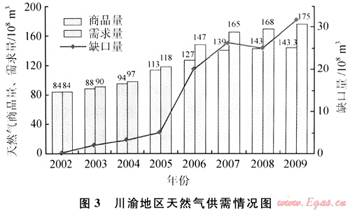 2002年,市場基本能維持平衡,但隨著天然氣市場的快速發(fā)展,各行業(yè)、各部門對其的需求量急速增長,導(dǎo)致市場供需缺口越來越大,市場平衡的任務(wù)愈加繁重。到2009年,市場缺口已經(jīng)高達(dá)30×108m3,如圖3所示。