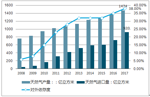 2008-2017 年,我國天然氣進(jìn)口量由 46 億方增長至 920 億方,年均復(fù)合增速 34.9%,而在產(chǎn)量方面, 2008 年我國天然氣產(chǎn)量為 803 億立方米, 2017 年則達(dá)到了 1474 億立方米,年均復(fù)合增長率為 6.97%,遠(yuǎn)低于進(jìn)口量與消費(fèi)量的增長水平。隨著進(jìn)口量的不斷增加,我國天然氣行業(yè)對(duì)外依存度也由 2008 年的 5.9%提高到 2017 年的 38%。