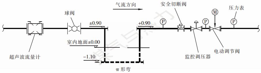 對(duì)于電動(dòng)調(diào)節(jié)閥與超聲波流量計(jì)串聯(lián)設(shè)置對(duì)后者的干擾問(wèn)題,結(jié)合國(guó)內(nèi)外先進(jìn)經(jīng)驗(yàn)和作者團(tuán)隊(duì)的深入研究,本站采用π形彎的方式進(jìn)行降噪,即利用4個(gè)三通拼接成一個(gè)π形[3]。在不同的方案中,可根據(jù)現(xiàn)場(chǎng)條件、場(chǎng)地大小形狀及檢修通道的布置來(lái)考慮π形彎是以平行還是垂直于地面的方式布置。π形彎布置[3]見(jiàn)圖1。
