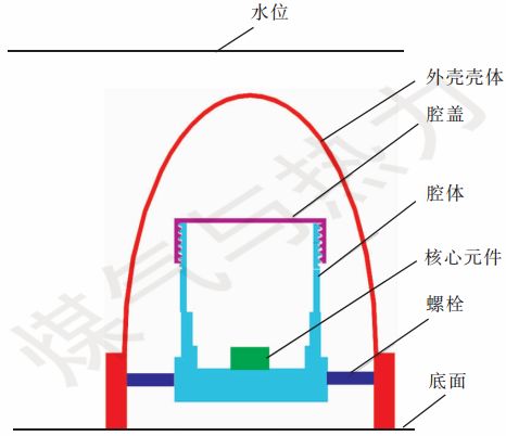 如圖2所示,防水透氣殼的外殼殼體采用橢球狀設(shè)計,腔體高度大于外殼殼體高度的1/2。當(dāng)水位沒過裝置底面達10 m時,防水透氣殼內(nèi)部氣體體積大約被壓縮到原體積的1/2,裝置的外殼殼體采用半橢球形設(shè)計,因此,此時外殼殼體內(nèi)水面在外殼殼體高度的1/2位置以下。本裝置腔體的設(shè)計高度大于外殼殼體高度的1/2,因此,防水透氣殼內(nèi)的水面位置在腔蓋以下,可以防止液態(tài)水進入腔體內(nèi)??梢姡词乖谒粵]過裝置底面達10 m的惡劣條件下,該裝置仍能夠?qū)η惑w內(nèi)的核心元件起到很好的保護作用。