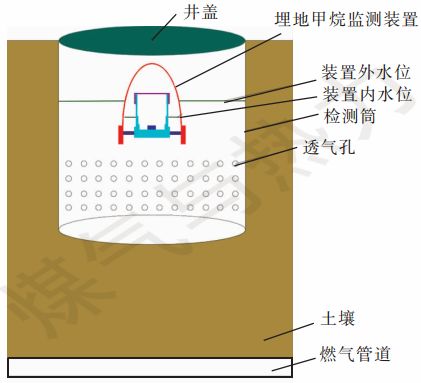 將埋地甲烷監(jiān)測裝置安裝在一個具有承壓及透氣功能的檢測筒內(nèi),檢測筒下方敞口,并與土壤接觸,內(nèi)部無土壤,檢測筒四周打孔,上方設(shè)置井蓋,井蓋與甲烷監(jiān)測裝置采用剛性連接,使得甲烷監(jiān)測裝置固定于檢測筒內(nèi),工作人員可以隨時對檢測筒內(nèi)的甲烷監(jiān)測裝置的傳感器及電池進行校準(zhǔn)及更換。檢測筒安裝在管道正上方。參考目前的燃氣管道泄漏點定位打孔深度為0.5 m,因此,燃氣檢測筒的通常高度為0.5 m,可根據(jù)管道埋深增加檢測筒高度。甲烷監(jiān)測裝置及檢測筒的布置見圖1。