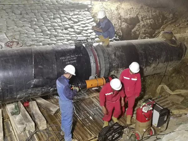 DR(數(shù)字射線)檢測焊口。DR(數(shù)字射線)檢測技術(shù)利用X射線的穿透特性和衰減特性,通過探測器獲得可被顯示和記錄的數(shù)字圖像。與傳統(tǒng)射線檢測技術(shù)相比,能夠在成像環(huán)節(jié)減少時間,同時在根焊、熱焊、填充一遍完成后進行DR檢測,確保了焊縫根部焊接質(zhì)量。