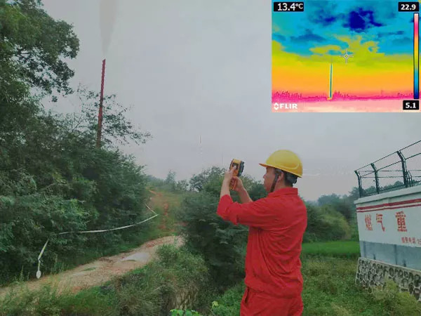 紅外熱成像儀監(jiān)測放空。因天然氣放空的節(jié)流效應(yīng),冷放空天然氣溫度與附近大氣存在一定差值,紅外熱成像儀將被測目標的紅外輻射能量分布圖反映到光敏元件上,從而獲得紅外熱像圖。使用熱成像圖可監(jiān)測天然氣在大氣中的擴散,發(fā)現(xiàn)異常情況可及時進行工藝調(diào)整,確保風(fēng)險受控。