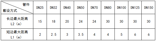 對(duì)于本文所述系統(tǒng)由固定點(diǎn)起,允許不裝補(bǔ)償器的直管段最大長度民用建筑為33m,工業(yè)建筑為42m。(管道伸長量分別為40mm和50mm)。實(shí)際設(shè)計(jì)時(shí)一般每段臂長不大于20~30m,不小于2m。在自然補(bǔ)償兩臂頂端設(shè)置固定支架。“г”型補(bǔ)償器一般用于DN150以下管道;最大允許距離與管徑關(guān)系見表1。“Z” 型補(bǔ)償器可以看做兩個(gè)“г”型補(bǔ)償器。