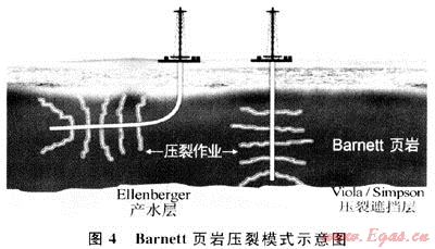 由于頁巖氣產(chǎn)能較低,通常埋深大、地層壓力高的頁巖儲(chǔ)層必須進(jìn)行水力壓裂改造才能夠?qū)崿F(xiàn)經(jīng)濟(jì)性開采。水力壓裂技術(shù)以清水為壓裂液,支撐劑較凝膠壓裂少90%,并且不需要黏土穩(wěn)定劑與表面活性劑,大部分地區(qū)完全可以不用泵增壓,較之美國20世紀(jì)90年代實(shí)施的凝膠壓裂技術(shù)可以節(jié)約成本50%~60%,并能提高最終估計(jì)采收率,目前已成為美國頁巖氣井最主要的增產(chǎn)措施(圖4)[14]。