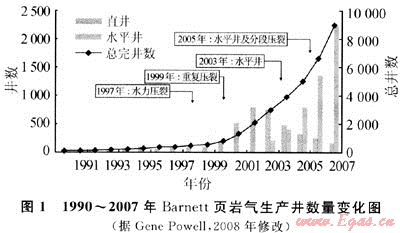 開發(fā)技術(shù)的創(chuàng)新尤其是水平井鉆井、壓裂技術(shù)以及裂縫綜合診斷技術(shù)的進(jìn)步與廣泛運(yùn)用在推動(dòng)沃斯堡盆地Barnett頁巖氣藏的快速發(fā)展中起著至關(guān)重要的作用。1981年,Barnett頁巖區(qū)在按計(jì)劃鉆探過程中偶然發(fā)現(xiàn)顯示良好的Barnett頁巖層段。自1981年第一口發(fā)現(xiàn)井到1992年歷經(jīng)10a生產(chǎn)井僅99口,開發(fā)緩慢。1997年后,水力壓裂開始取代凝膠壓裂成為頁巖氣主要的增產(chǎn)措施,Barnett頁巖氣的開發(fā)也隨之加快了前進(jìn)的步伐。隨著1999年重復(fù)壓裂、2003年水平鉆井以及2005年水平井分段壓裂等一系列新技術(shù)的廣泛運(yùn)用,Barnett頁巖氣發(fā)展速度驚人(圖2),從1997~2007年的10a時(shí)間里,Barnett頁巖氣區(qū)有多達(dá)8629口頁巖氣井投入生產(chǎn)(其中水平井4973口,占50%以上)。新技術(shù)的運(yùn)用同樣使Barnett頁巖氣產(chǎn)量發(fā)生了翻天覆地的變化,截至2008年1月,Barnett頁巖氣產(chǎn)量約0.996×108m3/d,累計(jì)產(chǎn)量1044.9×108m3[3]。