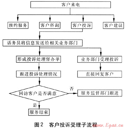 在“確認(rèn)客戶辦理類型”步驟中,我們又可以根據(jù)客戶辦理的類型劃分出以下子流程,用以指導(dǎo)話務(wù)員按照詳細(xì)的作業(yè)指南進(jìn)行操作。即:預(yù)約服務(wù)受理子流程、客戶咨詢受理子流程、客戶投訴受理子流程、客戶建議處理子流程。以客戶投訴受理子流程為例,我們可以繪制出相應(yīng)的流程圖(見圖2)。