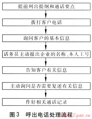 由于辦理業(yè)務(wù)需要,有時(shí)燃?xì)鉄峋€中心的話務(wù)員要主動(dòng)給客戶打電話。呼出電話也需要按照一定的作業(yè)流程,準(zhǔn)確向客戶傳達(dá)信息,與客戶進(jìn)行有效的電話溝通。呼出電話處理流程見圖3。