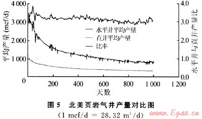 1) 水平井+多段壓裂技術(shù)的大規(guī)模成功應(yīng)用[4~6]。水平井的成本一般是垂直井的1~1.5倍,800~1000m水平段的常規(guī)水平井鉆井及完井投資約為700萬美元,而產(chǎn)量是垂直井的3倍左右(圖5)。目前85%的頁巖氣開發(fā)井為水平井+多段壓裂,如美國新田公司在Woodford頁巖中的部分開發(fā)井采用5~7段式壓裂,頁巖氣增產(chǎn)效果顯著(見表1)。
