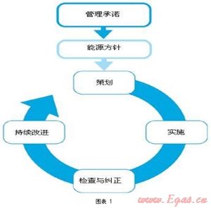 用能企業(yè)是實現(xiàn)能源節(jié)約的核心。在以節(jié)能減排為重要目標的指引下,企業(yè)使用任何能源,都應制定一個基本的控制程序,形成一個有效能源管理體系運行模式。企業(yè)為兌現(xiàn)管理承諾和實現(xiàn)能源方針應進行策劃-實施-檢查與糾正-持續(xù)改進(PDCA)等過程。圖示如下(圖表1):