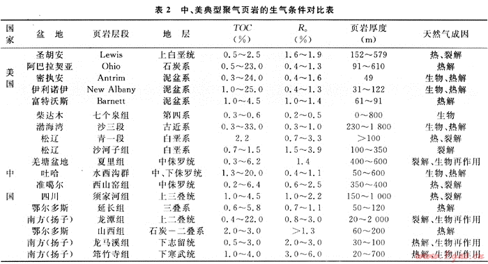 中國與美國在頁巖氣富集條件上具有許多相似之處,美國頁巖氣大規(guī)模的成功開發(fā)為中國的頁巖氣勘探研究提供了參考模式。在美國,圍繞加拿大地盾南緣形成了廣泛的古生界海相沉積,后期的改造和演化形成了現(xiàn)今呈弧形展布的一系列盆地;在中國,塔里木、華北和揚子地臺及其周緣廣泛發(fā)育了不同地質時代的多套黑色頁巖,其頁巖氣形成條件完全可與北美相媲美(表2)。以美國東部與中國南方為例,兩者分別在頁巖發(fā)育時代、地層沉積格局、有機質熱演化程度、后期構造演化、破壞程度與保存條件、頁巖含氣性以及頁巖氣聚集模式等方面具有可比之處。從兩者系統(tǒng)對比的結果可以看出,中國頁巖氣形成的地質條件優(yōu)越。