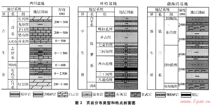 古生代結束以來,全球性的區(qū)域板塊運動導致亞洲大陸發(fā)生碰撞作用并經(jīng)受了強烈的擠壓作用[9~10],在各板塊拼合并導致海水區(qū)域性退出的同時,使得古生界海相頁巖地層經(jīng)受了強烈改造、擠壓變形或隆升剝蝕,在揚子地區(qū)普遍形成了大面積暴露及近地表埋藏的古生界頁巖。而在構造相對穩(wěn)定的華北、塔里木等地臺區(qū),構造保存條件相對較好,目前仍有埋深不等的多套較大厚度的海相頁巖地層分布。不同有機質條件、埋藏深度和產(chǎn)烴能力的黑色頁巖分別可能成為其他層位油氣富集的烴源巖、可能具有原地“成藏”特點[11~12]頁巖氣的物質基礎或者兩種可能;進入中生代,陸相沉積逐漸成為主體,主要在中國北方地區(qū)形成了區(qū)域分布的三疊系(如鄂爾多斯盆地等,也包括川西[13~15])、侏羅系(如準噶爾[16]、吐哈等盆地)及白堊系(如松遼[17]、海拉爾等盆地)湖相暗色泥頁巖。雖然新生代的差異性構造運動導致了部分地層的裸露剝蝕,但目前仍有大規(guī)模的殘留保存和區(qū)域分布,結果導致產(chǎn)生了不同地質時代、埋藏深度和熱演化程度泥頁巖的同時發(fā)育。對于抬升幅度較大、保存條件較差的富含有機質泥頁巖,雖然它們已不再適合作為常規(guī)天然氣圈閉的源巖基礎,但仍有可能是頁巖氣資源富集的潛在目標;與古生界和中生界泥頁巖的多期作用特點不同,新生界泥頁巖主要發(fā)育在保存條件較好的盆地區(qū)域內[18]。由于其他層系天然氣的聚集需要首先滿足其自身對天然氣聚集的需要,故常規(guī)油氣地質分析中的氣源巖(泥頁巖)將有可能同時成為頁巖氣勘探的新對象。
