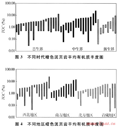 古生界、中生界分布范圍較廣并大致以天山為中心形成南、北“蹺蹺板”式沉積特點,即早古生代時以天山以南的塔里木地塊為沉降沉積中心,形成較大面積分布的海相頁巖。晚古生代時則以天山以北的準噶爾地塊為中心形成頁巖沉積。晚二疊紀末中生代以來,全區(qū)進入陸相沉積環(huán)境,“蹺蹺板”運動基本結束,總體上表現(xiàn)出總有機碳含量向上逐漸增加的趨勢。