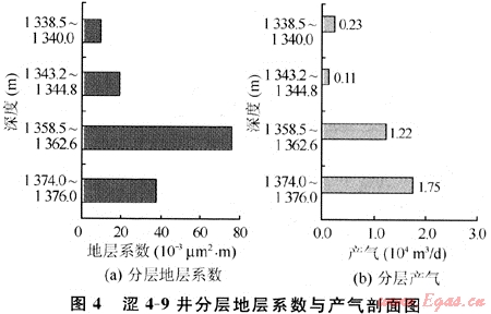 澀北一號氣田四-1單元各井滲透率5.4×10-3~49.1×10-3μm2,滲透率級差為1.8~54.7,各井表現(xiàn)為強中等非均質(zhì)性。產(chǎn)氣剖面測試結(jié)果表明,各井在縱向上產(chǎn)量貢獻差異非產(chǎn)大。如澀4-9井最大滲透率為16.3×10-3μm2,滲透率級差為3.7,地層系數(shù)越高(圖4-a),分層產(chǎn)量也越高(圖4-b),由此可見,多層合采時層間非均質(zhì)性嚴重影響低滲層的儲量動用。