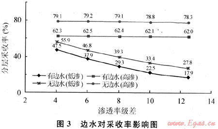 根據(jù)澀北氣田水體能量,水體體積大小為20倍烴類體積,日產(chǎn)氣量2×104m3。應(yīng)用數(shù)值模擬單井模型,邊水采用網(wǎng)格水體,模擬表明:滲透率級差越大,儲量動用程度越低,邊水對采收率影響越大。多層合采開發(fā),邊水對高滲層影響大,由圖3可以看出高滲層的分層采收率,存在邊水條件下比定容氣藏減少16.3%~16.9%,低滲層則只減少8.4%~10.8%。模擬表明:高滲儲層壓力下降速度明顯高于低滲層,邊水突破后嚴重影響低滲層儲量動用。