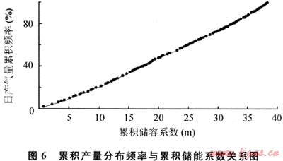 由圖6可以看出:日產(chǎn)氣量與累計儲容系數(shù)相關(guān)性很好。表明分層產(chǎn)量除受地層系數(shù)影響外,還與儲容系數(shù)有關(guān),即高滲層的儲量決定了氣井的產(chǎn)量水平和穩(wěn)產(chǎn)能力。綜合分析認為,四-1單元高滲層中儲量所占比例較少,不能滿足目前氣井配產(chǎn)的穩(wěn)產(chǎn)需求,由此表現(xiàn)出氣井產(chǎn)量遞減。