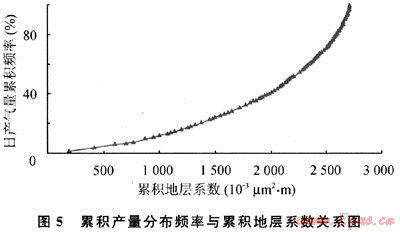 選用該射孔單元共17口井55井次產(chǎn)氣剖面測試數(shù)據(jù),同一口井多次測試分層產(chǎn)量選取其平均產(chǎn)量。按滲透率由大到小進行排序,對各小層的產(chǎn)量、地層系數(shù)(Kh)和儲容系數(shù)(φhSg)進行累加,作累積產(chǎn)量分布頻率與累積地層系數(shù)關(guān)系圖(圖5)。